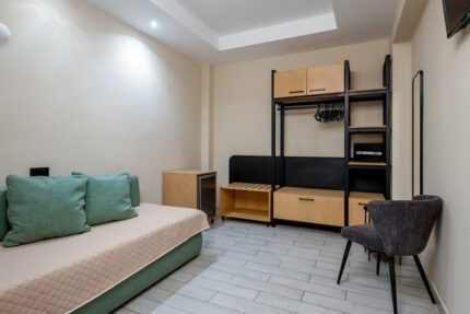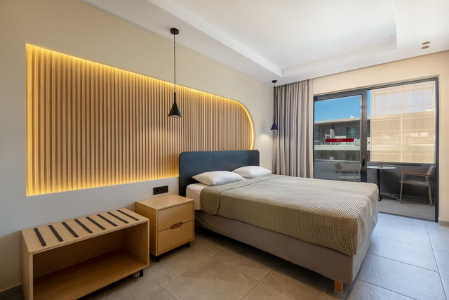 The One Bedroom Suite offers a spacious and comfortable environment, ideal for guests who want more room to relax during their stay. With a separate bedroom and a functional layout, it is a practical choice for couples, families or small groups visiting Kos.